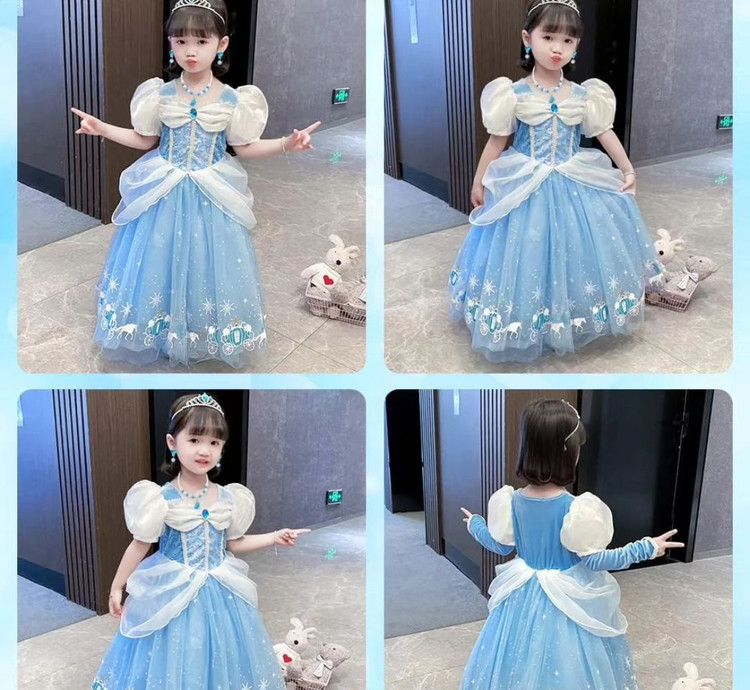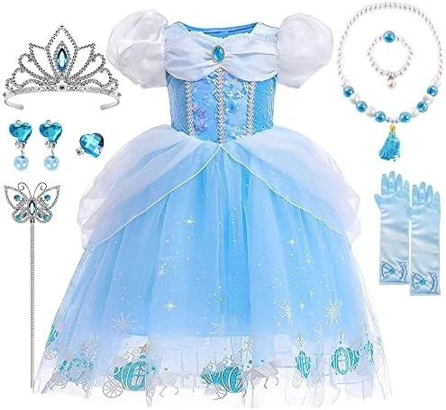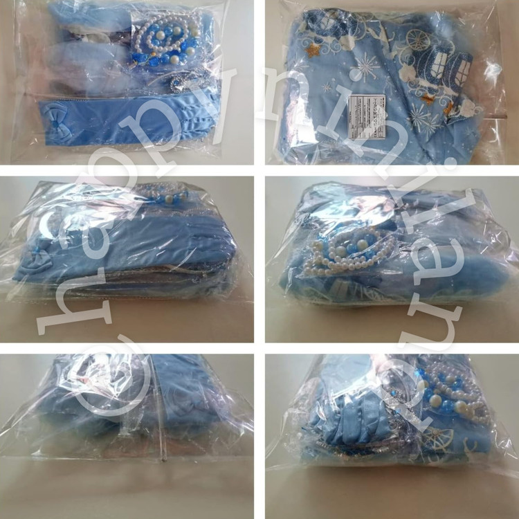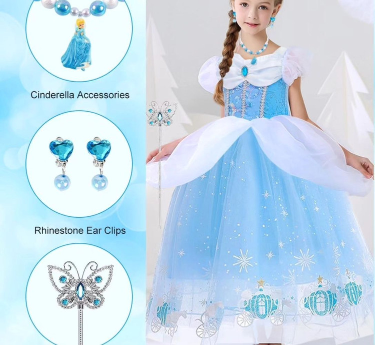 پیراهن سیندرلا به همراه اکسسوری های موجود در عکس شامل : تاج، عصا، گردنبند، دستبند، گوشواره، انگشتر، دستکش
